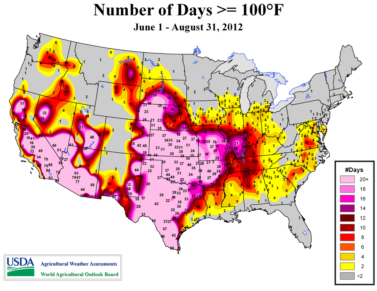 - Number of days over 100F, Summer 2012. Map of US. 2012 was hot, even for Michigan where temperatures reached 112F in my area.